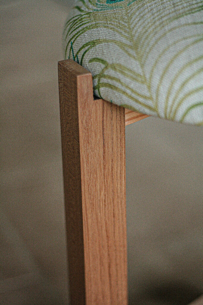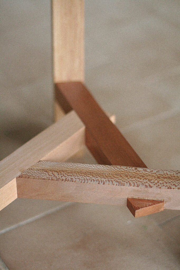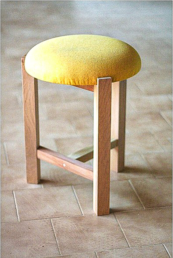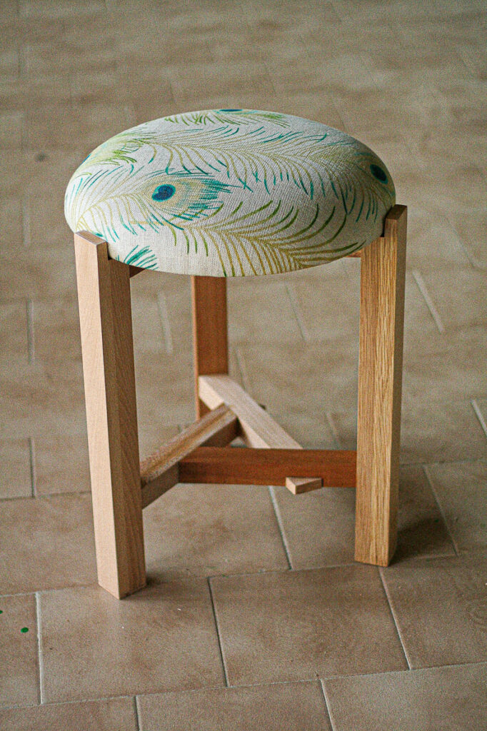 En 2022, j’ai fait ces tabourets dans le cadre de la formation « menuisier agenceur » que j’ai faite à 3PA. J’avais récupéré les assises de mon restaurant La Petite Ménagerie. On les avait fabriquées dans l’atelier d’Aurélie, « Du chic et du rétro », une copine tapissière à Montreuil. J’ai beaucoup aimé faire les plans et utiliser les différentes essences de bois. J’ai testé différents assemblages.