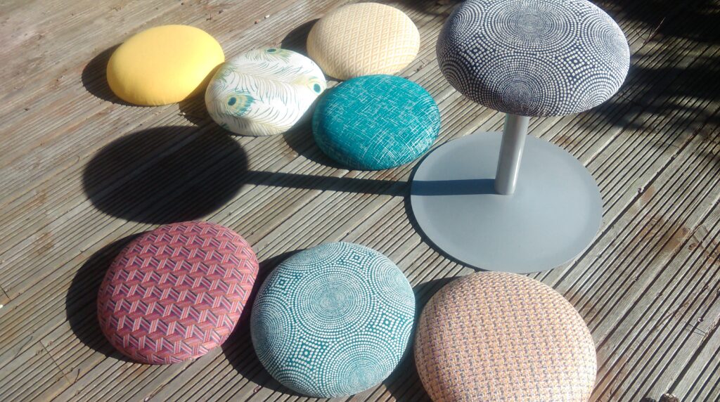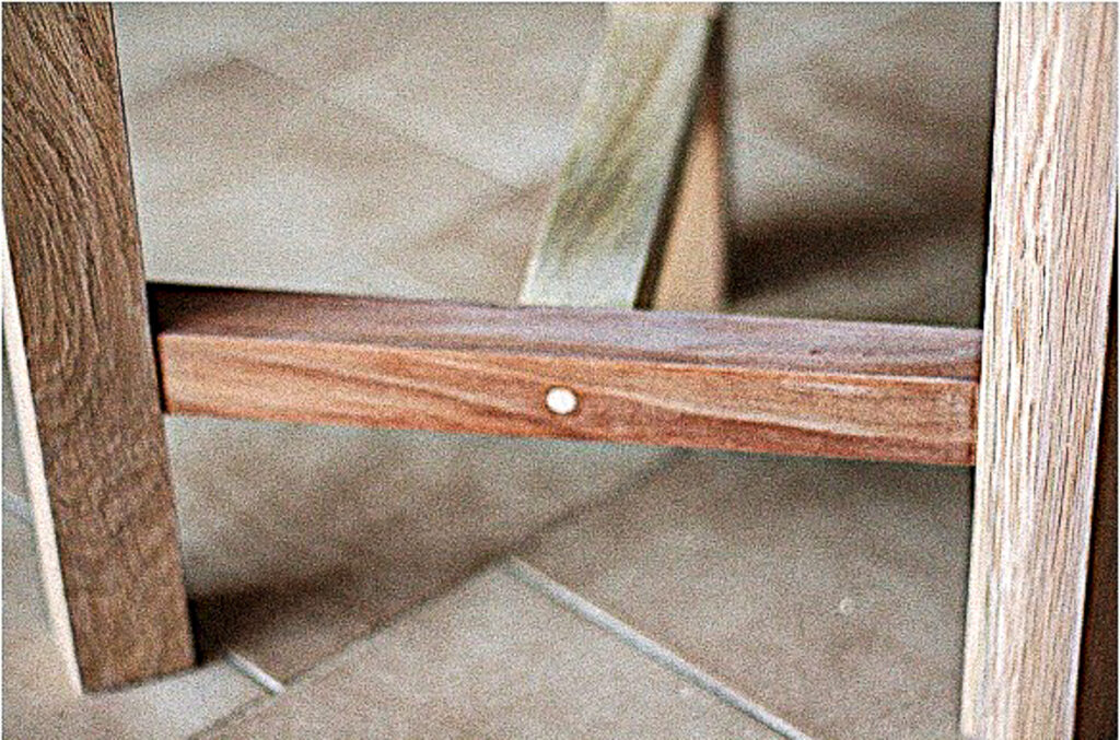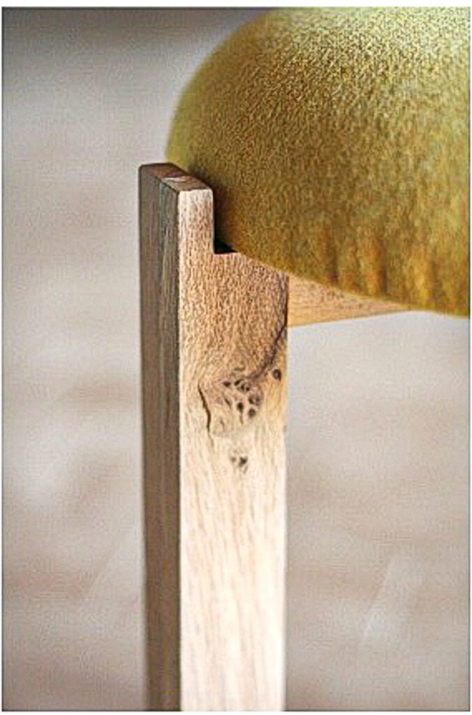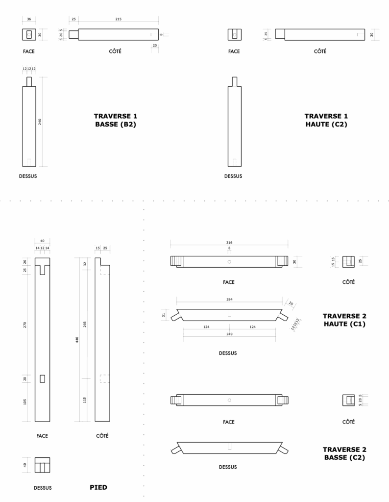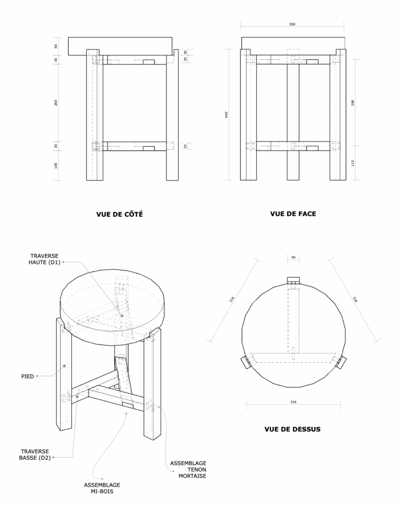 En 2022, j’ai fait ces tabourets dans le cadre de la formation « menuisier agenceur » que j’ai faite à 3PA. J’avais récupéré les assises de mon restaurant La Petite Ménagerie. On les avait fabriquées dans l’atelier d’Aurélie, « Du chic et du rétro », une copine tapissière à Montreuil. J’ai beaucoup aimé faire les plans et utiliser les différentes essences de bois. J’ai testé différents assemblages.
