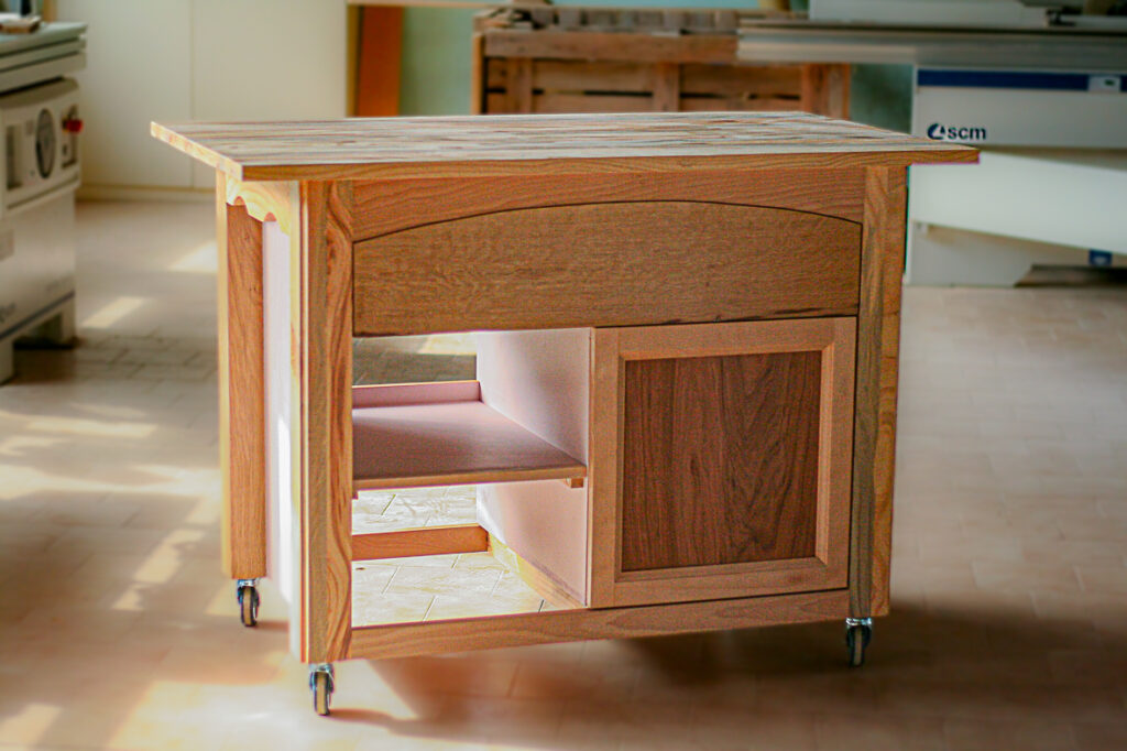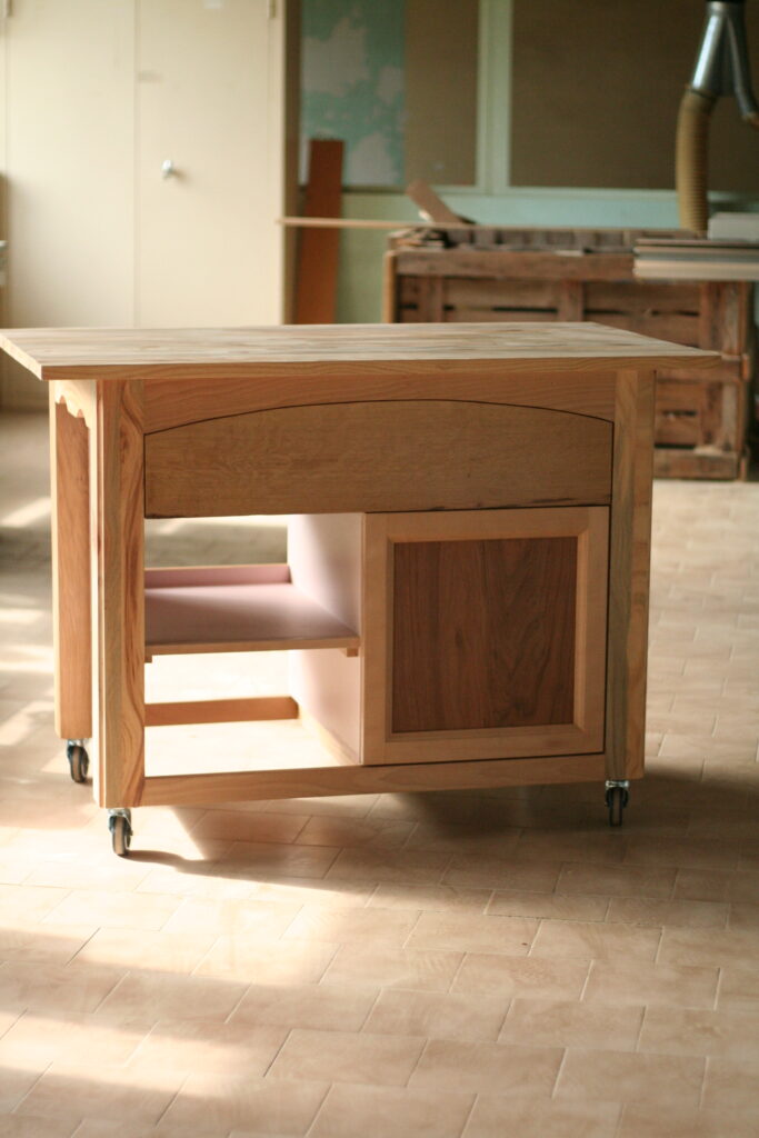 Exercice imposé lors de titre pro menuiserie. J’ai choisi le pin sylvestre pour le plateau et les pieds. La façade du tiroir est en hêtre et la porte en panneau plaqué noyer.